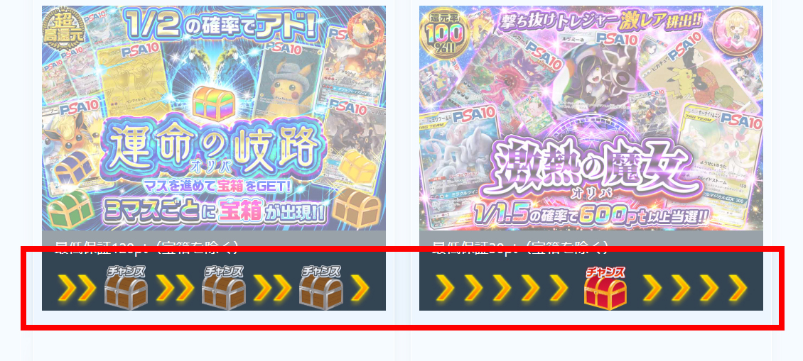 オリパを引くと1マス進むことができ、宝箱に到達すると、通常の抽選とは別に追加で商品がもらえるお得なオリパです。