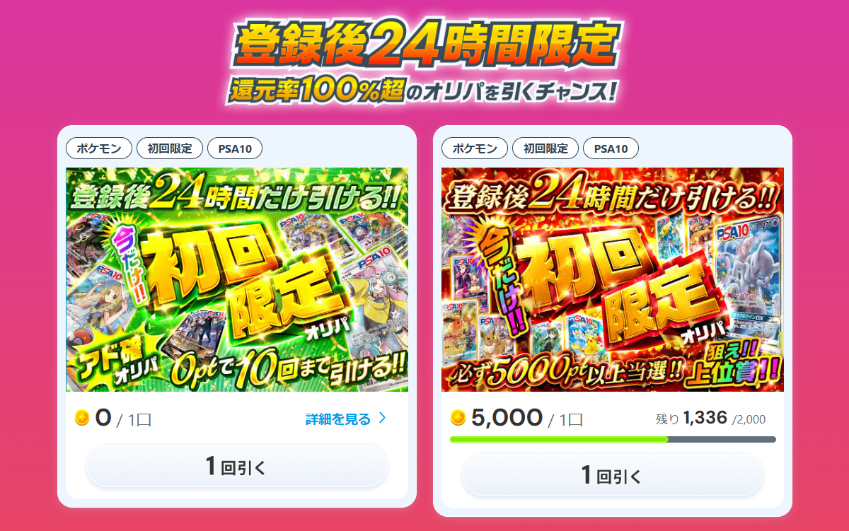 | 初回特典 | 登録24時間限定の還元率100%超えのオリパ |